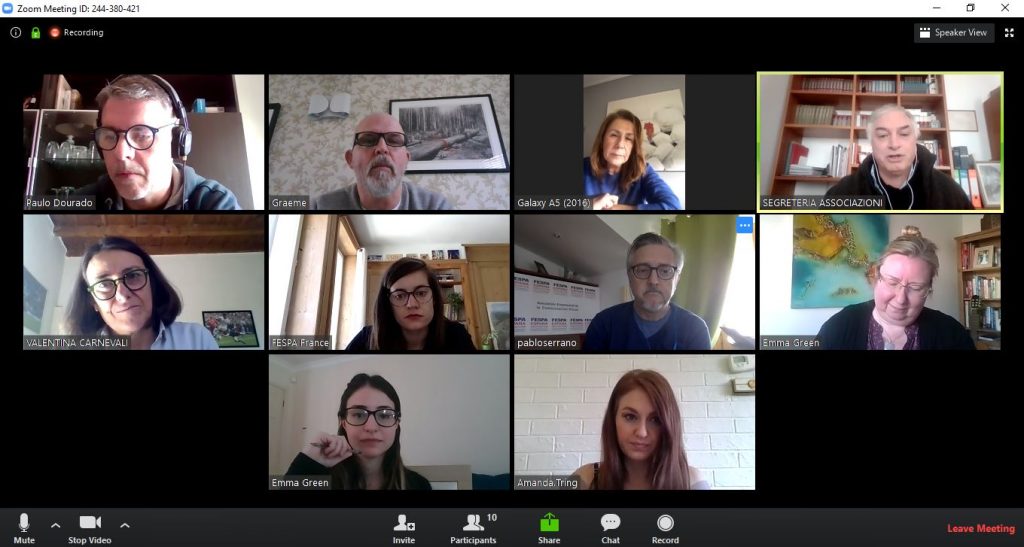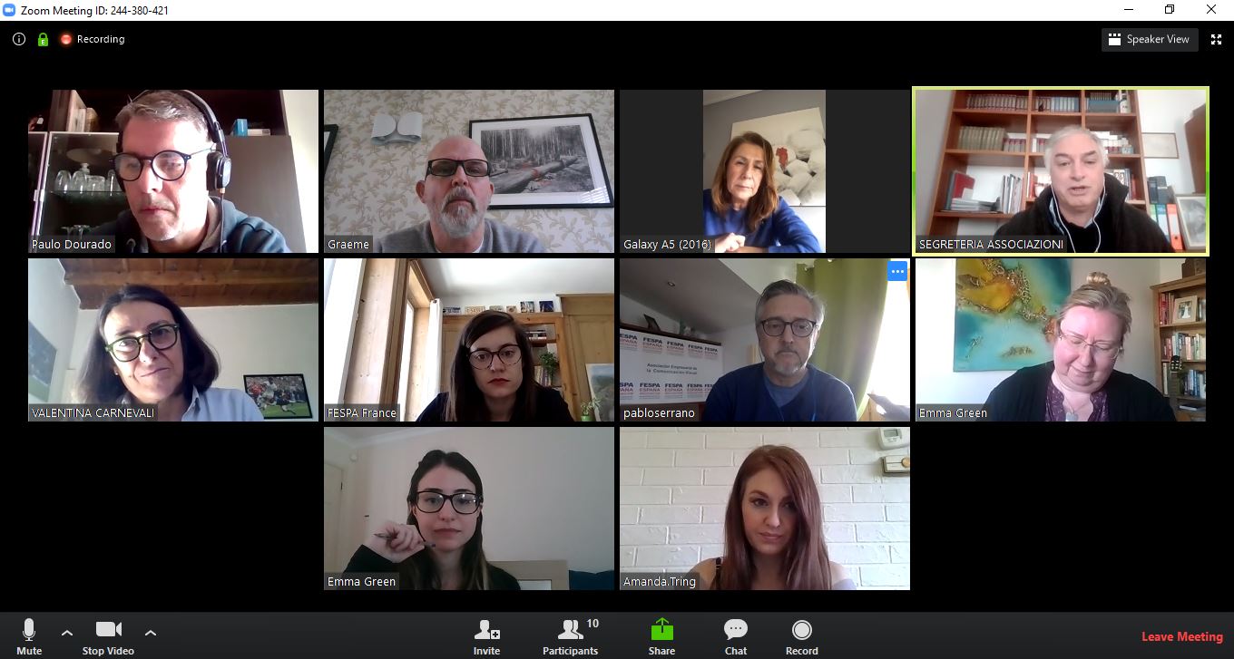 Тази сутрин се присъединих към онлайн дискусия с Феспа асоциациите от Франция, Италия, Испания, Португалия и Гърция, заедно с моите колеги от Феспа в Англия посредством Zoom платформата. Темата бе дискусия за отражението на кризата върху членовете им и как те откликват на техните искания за подкрепа.